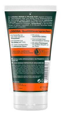 The REPAIR & PFLEGE KUR LOGONA repairs stressed, damaged hair and increases its resistance. The rich, vegan repair & care formula of natural origin with BIO sea buckthorn nourishes the hair deeply and counteracts hair breakage.