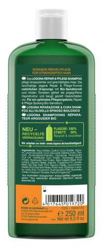 The REPAIR & PFLEGE SHAMPOO LOGONA cares for stressed and damaged hair. The rich, vegan repair & care formula of natural origin with BIO sea buckthorn oil and mild surfactants smooths the damaged hair structure and specifically prevents hair damage. Massage gently into damp hair, leave on briefly and rinse. Recommended for daily use.